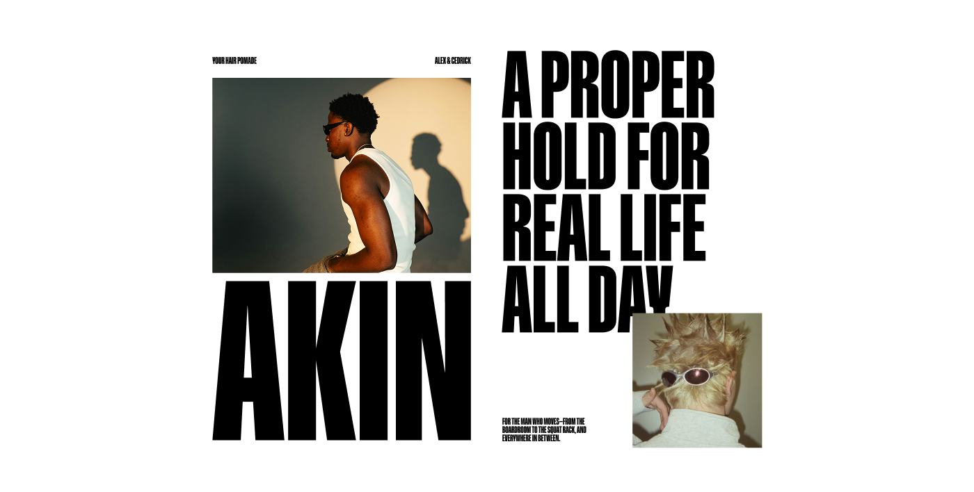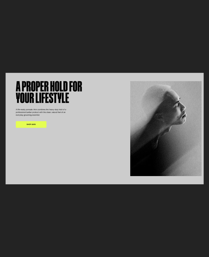 For the homepage, I focused on creating a strong, immediate impression that communicates both the brand and product value. Bold typography and lifestyle imagery highlight Akin’s clean performance and breathable hold, while reinforcing what sets it apart from traditional pomades. Clear, intentional CTAs guide users to the product detail page, keeping the experience focused on conversion.